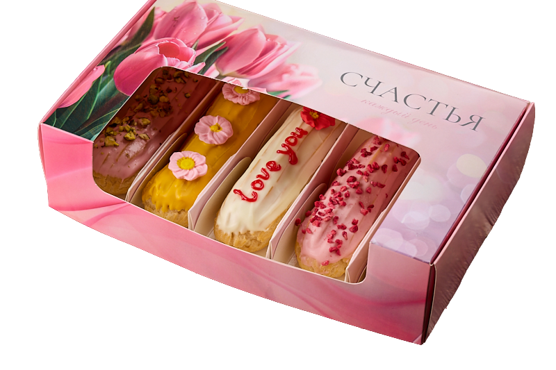 Мы открыли предзаказ на праздничный набор эклеров к 8 марта. В коробке пять разных вкусов: