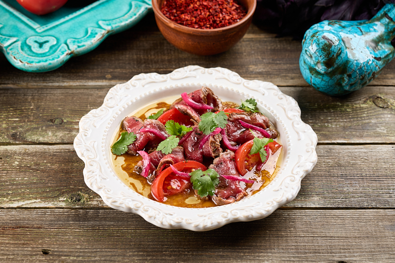 • Татаки из говядины с трюфельным понзу, сладкими томатами и кинзой