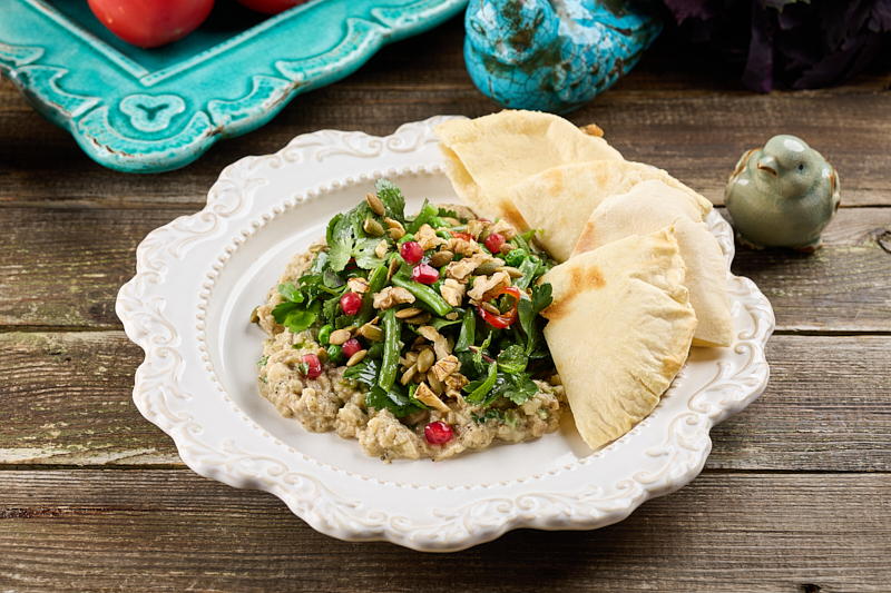 • Бабагануш с мацони, зелёными овощами и тёплой питой