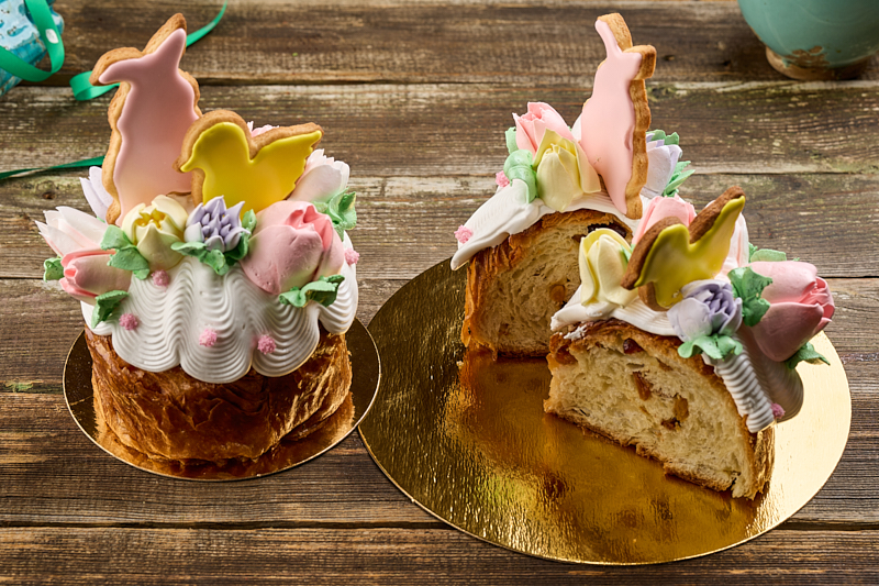Наш главный герой. Мы печём его из воздушного теста на сливочном масле, добавляя много сочного изюма, клюкву и ароматную цедру цитрусовых. Верхушку украсили, как весенний сад: нежнейшим зефиром ручной работы и хрустящим печеньем. Настоящее украшение вашего застолья.